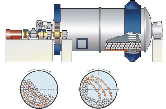 鋯英石球磨機(jī)主要由給料部、出料部、回轉(zhuǎn)部、傳動(dòng)部(減速機(jī),小傳動(dòng)齒輪,電機(jī),電控)等主要部分組成。
